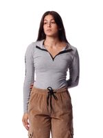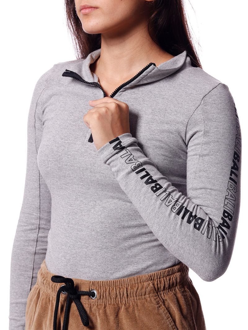 """body gola alta, com zíper jacaré e recorte nas mangas.