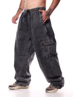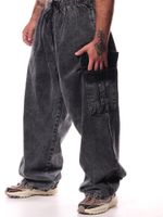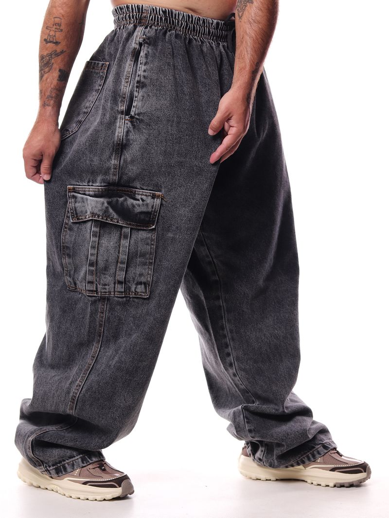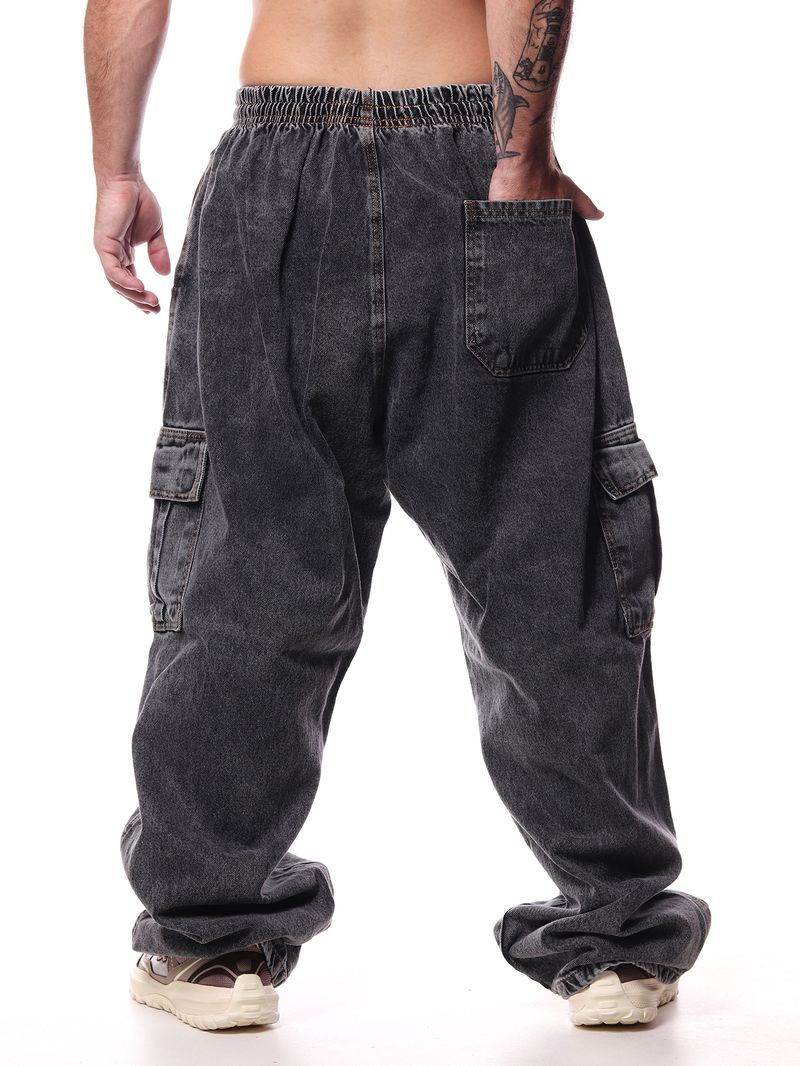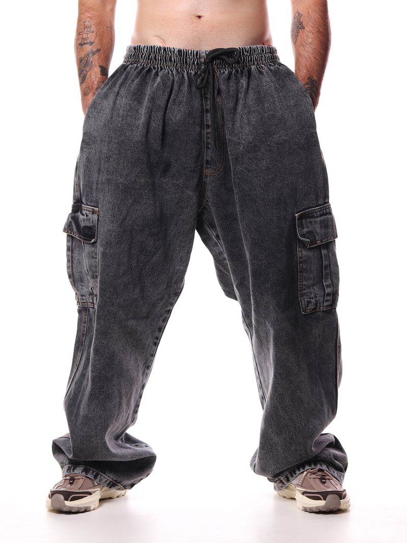 Confeccionada em jeans de alta qualidade, a peça conta com bolsos cargo laterais, que agregam praticidade e reforçam a estética streetwear e utilitária. A lavagem preta garante versatilidade, facilitando combinações com camisetas, moletons e jaquetas.